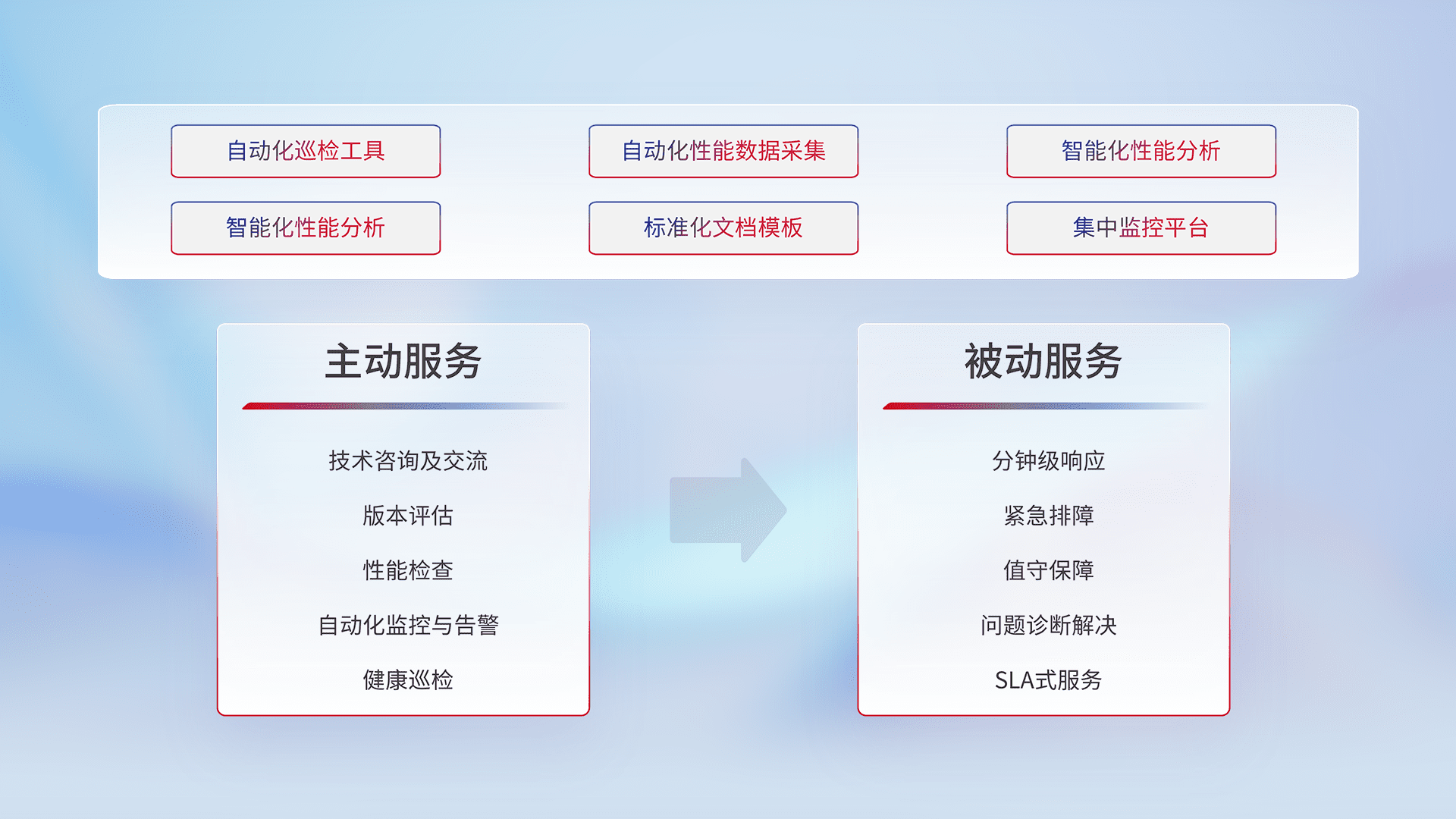 智能化工具和标准化文档,,保障服务质量,,提供主动服务(包含技术咨询、、、版本评估、、、、性能检查、、、自动化监控与告警、、、健康巡检)和被动服务包含(分钟级响应、、、紧急排障、、、值守保障、、、、问题诊断解决、、、SLA服务)。。。