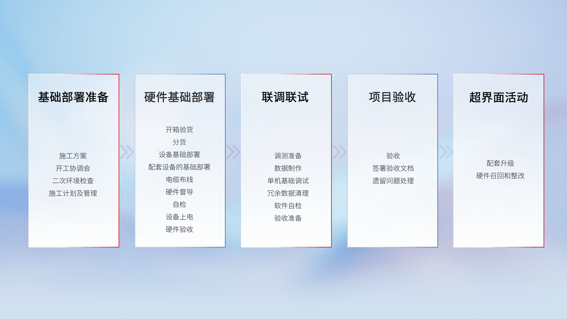 从基础部署准备、、、硬件基础部署、、联调联试、、、、项目验收、、、越界面活动的全过程可追溯,,保证施工质量和进度。。